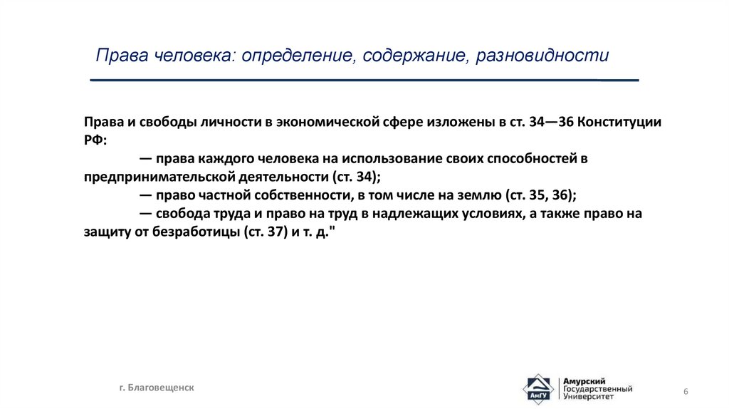 Права человека: определение, содержание, разновидностиПрава и свободы личности в экономической сфере изложены в ст. 34—36 Конституции