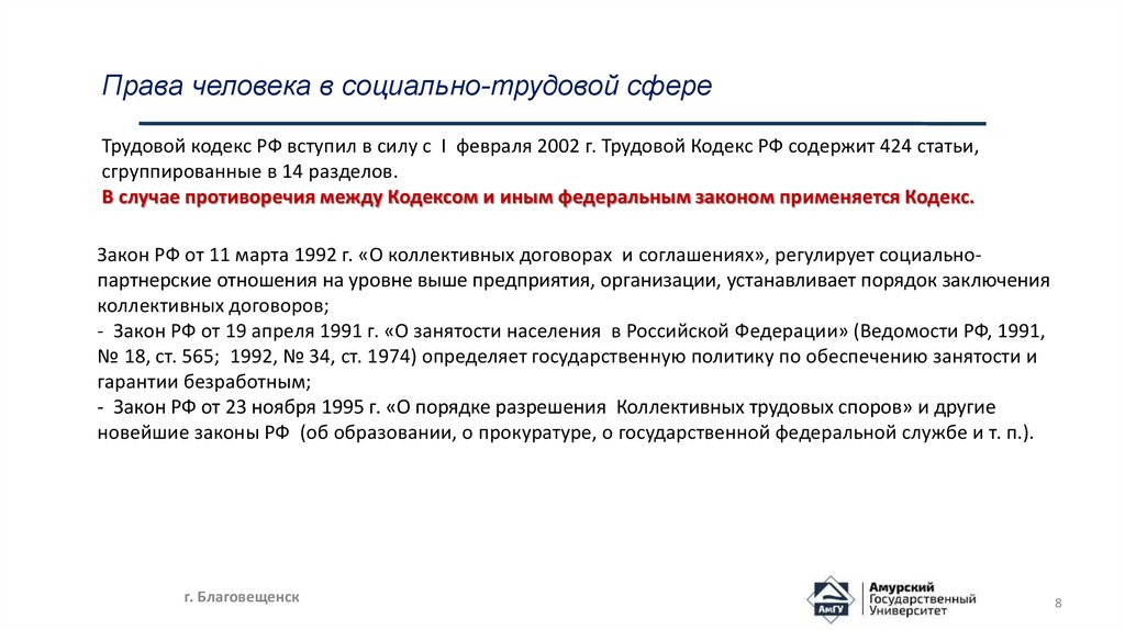 Права человека в социально-трудовой сфереТрудовой кодекс РФ вступил в силу с I февраля 2002 г. Трудовой Кодекс РФ содержит 424 статьи,