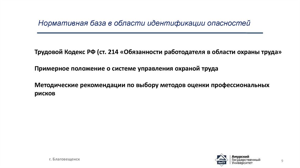 Нормативная база в области идентификации опасностейТрудовой Кодекс РФ (ст. 214 «Обязанности работодателя в области охраны труда»