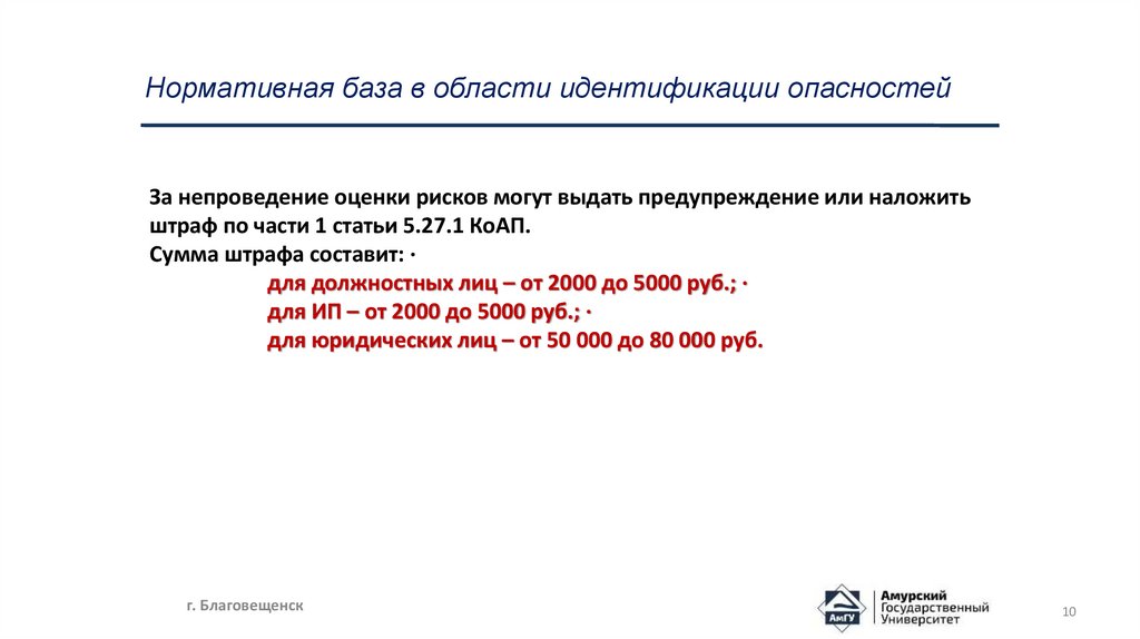 Нормативная база в области идентификации опасностейЗа непроведение оценки рисков могут выдать предупреждение или наложить