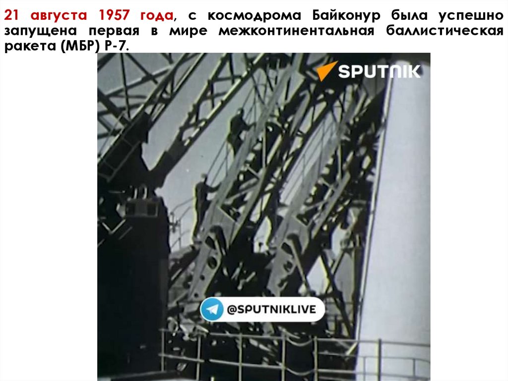 6. 21 августа 1957 года, с космодрома Байконур была успешно запущена первая в мире межконтинентальная баллистическая ракета (МБР)