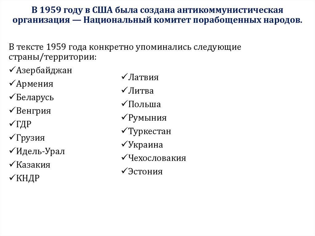 В 1959 году в США была создана антикоммунистическаяорганизация — Национальный комитет порабощенных народов.