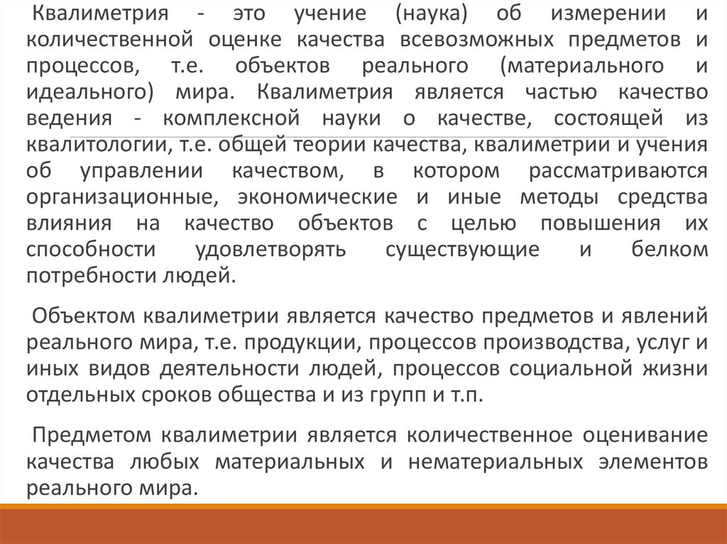 Квалиметрия - это учение (наука) об измерении иколичественной оценке качества всевозможных предметов и