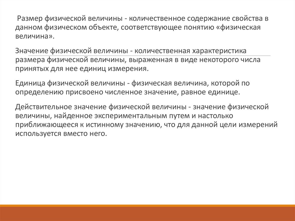 Размер физической величины - количественное содержание свойства вданном физическом объекте, соответствующее понятию «физическая