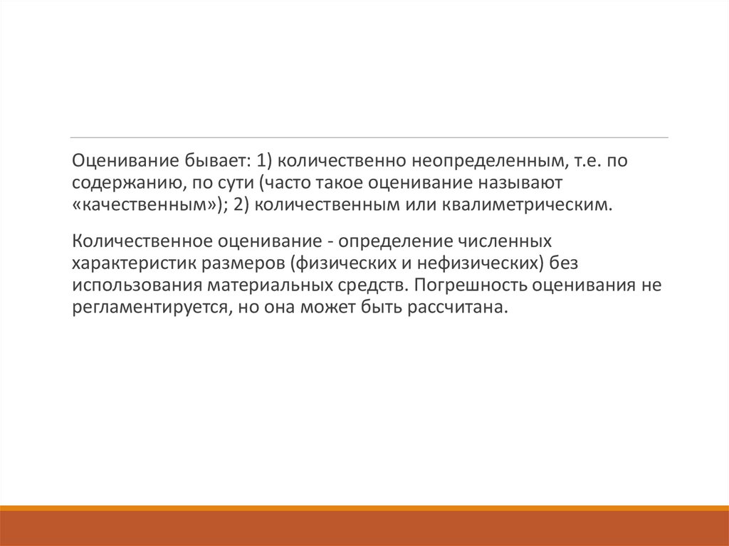 Оценивание бывает: 1) количественно неопределенным, т.е. посодержанию, по сути (часто такое оценивание называют