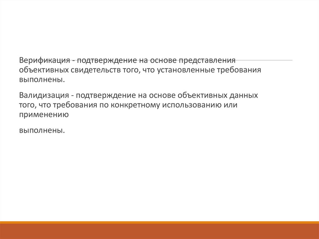 Верификация - подтверждение на основе представленияобъективных свидетельств того, что установленные требования