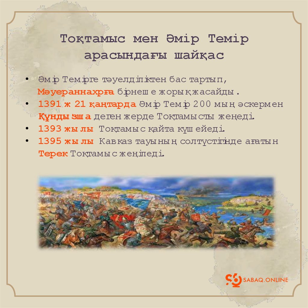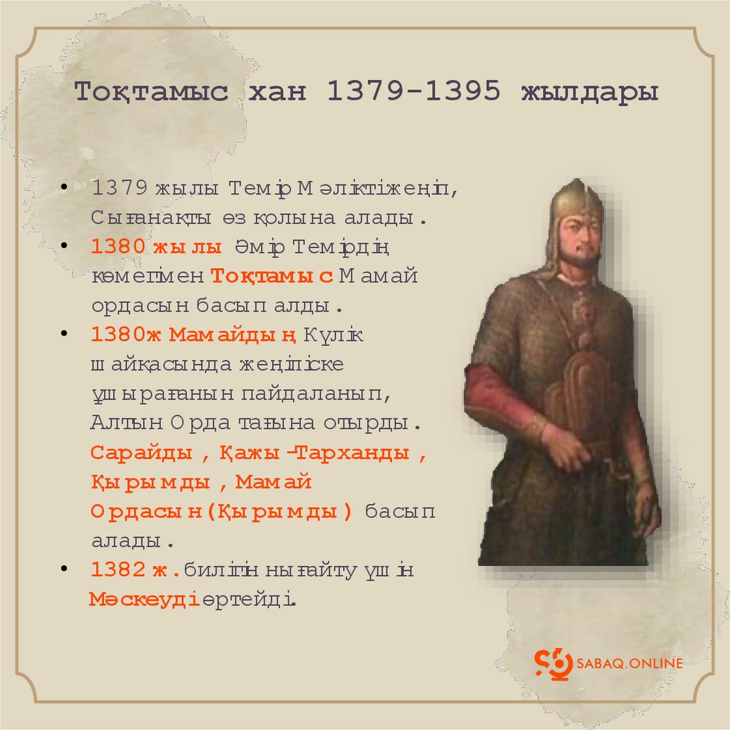 Тоқтамыс хан 1379-1395 жылдары• 1379 жы лы Темір М әліктіжеңіп,