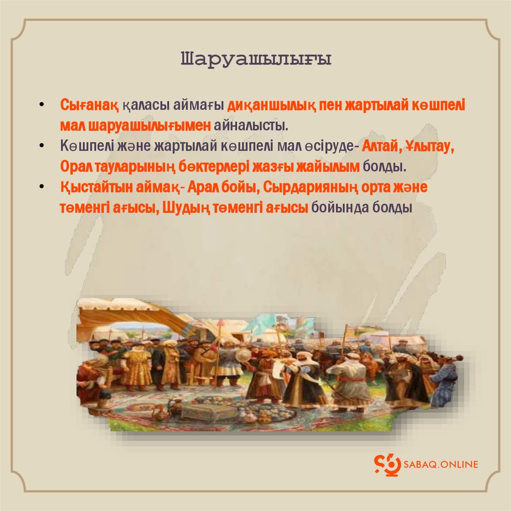 Шаруашылығы• Сығанақ қаласы аймағы диқаншылық пен жартылай көшпелі