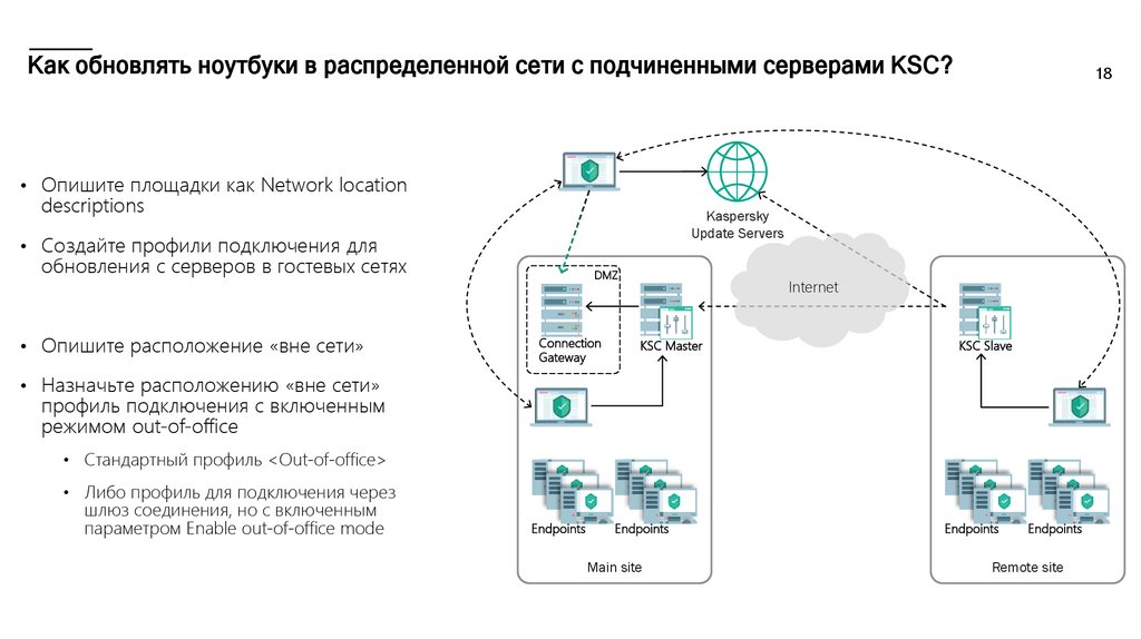 Как обновлять ноутбуки в распределенной сети с подчиненными серверами KSC?• Опишите площадки как Network location