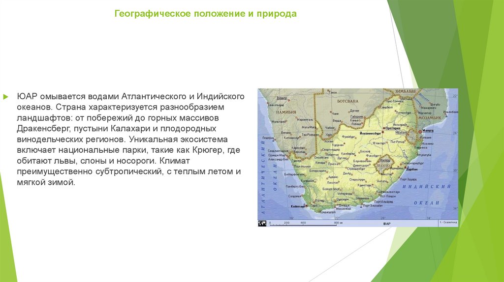 Географическое положение и природаЮАР омывается водами Атлантического и Индийского