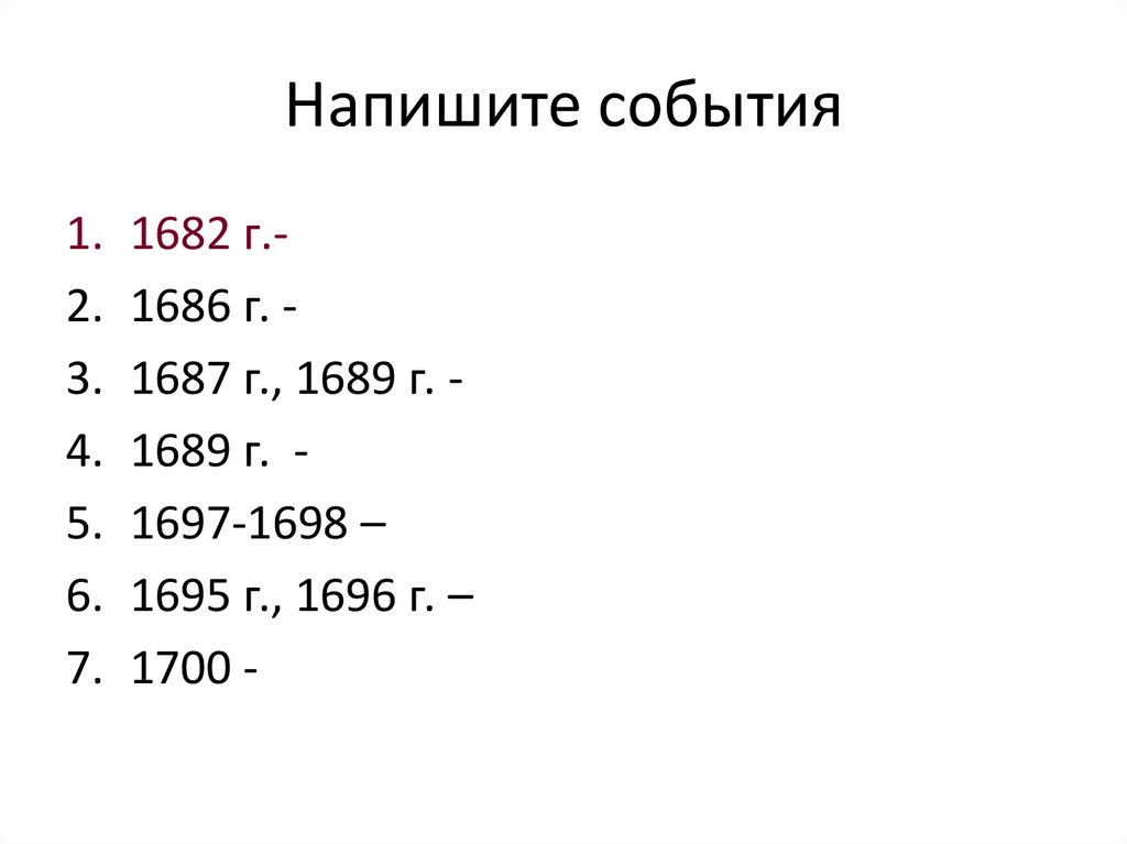 1. 1682 г.2. 1686 г. 3. 1687 г., 1689 г. 4. 1689 г. 5. 1697-1698 –6. 1695 г., 1696 г. –