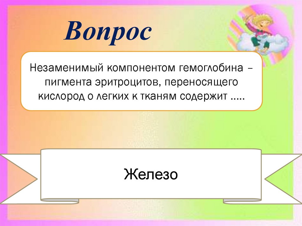 ВопросНезаменимый компонентом гемоглобина –