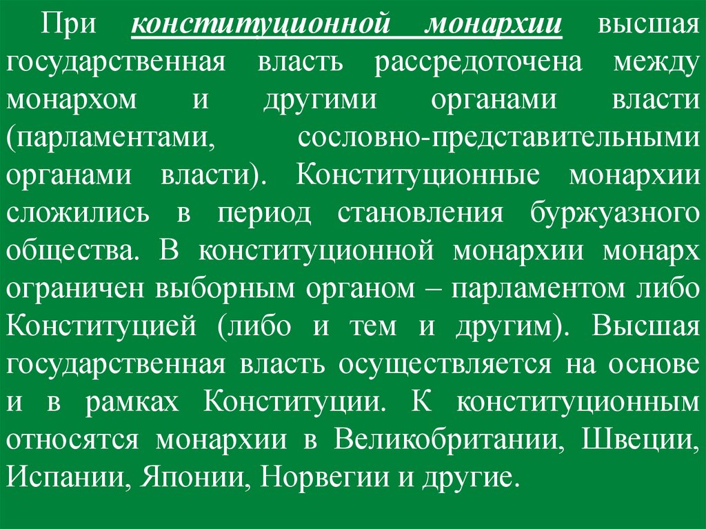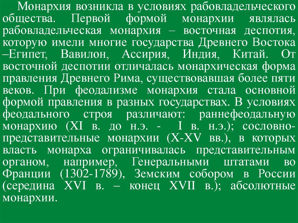 Монархия возникла в условиях рабовладельческогообщества. Первой формой монархии являлась
