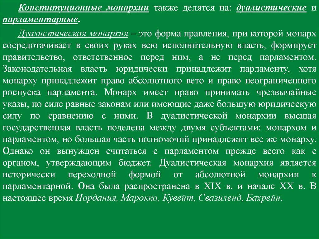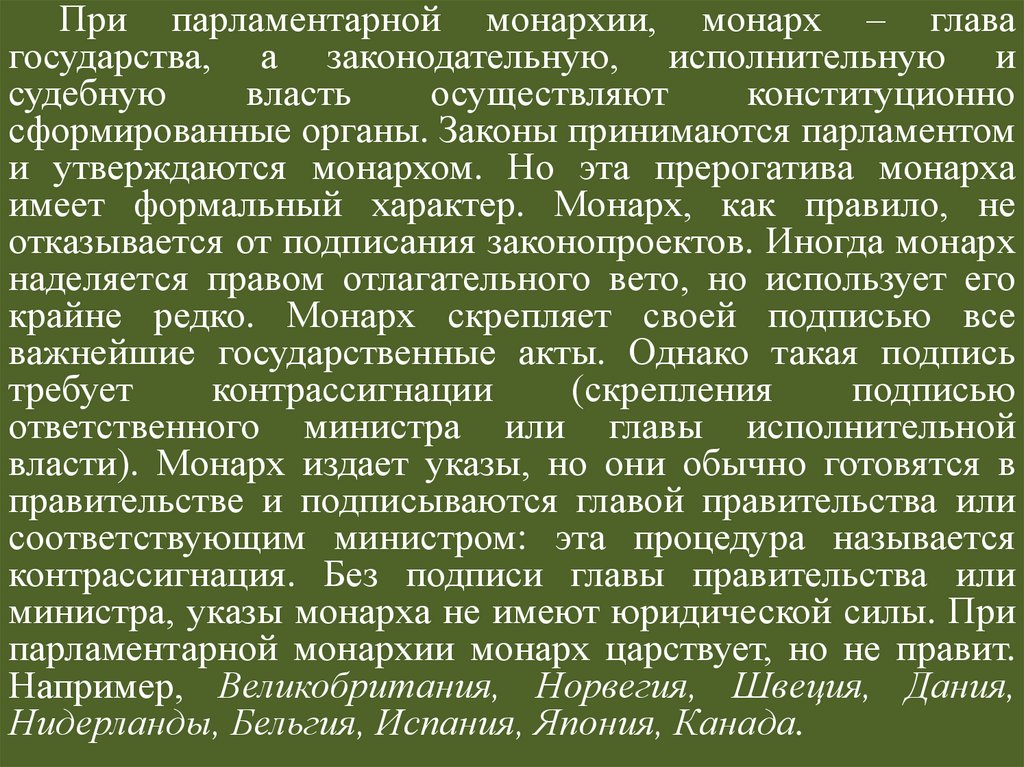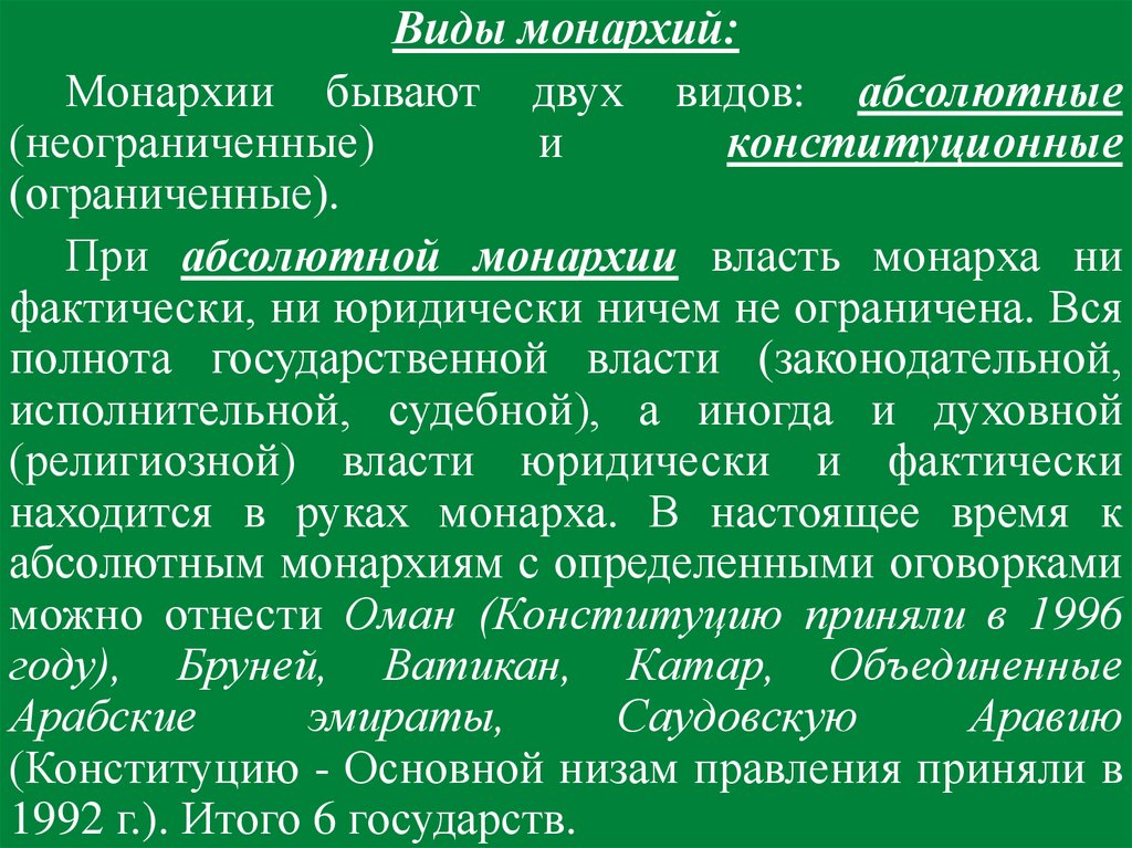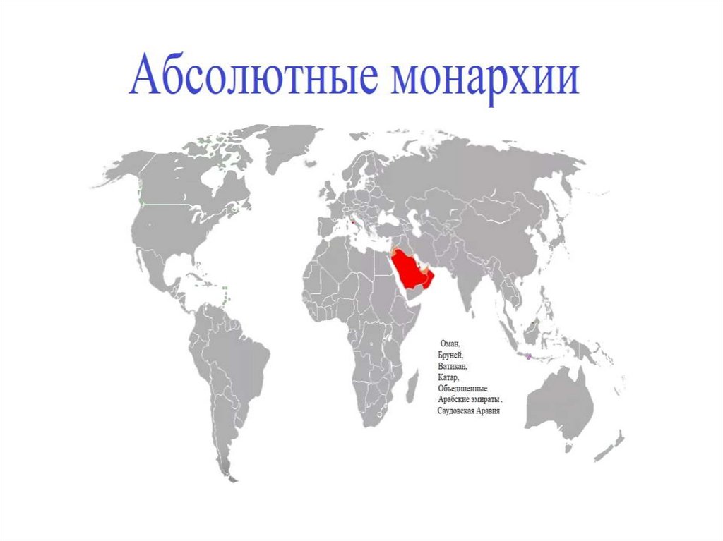 1) Верховная власть принадлежит одному лицу единоличному главе государства;