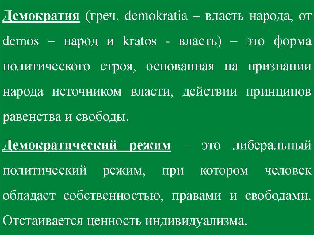 Демократия (греч. demokratia – власть народа, отdemos – народ и kratos - власть) – это форма