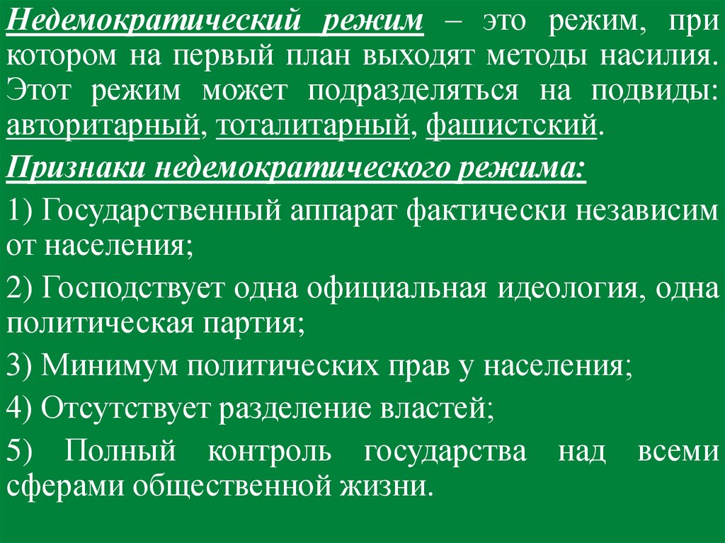 Недемократический режим – это режим, прикотором на первый план выходят методы насилия.