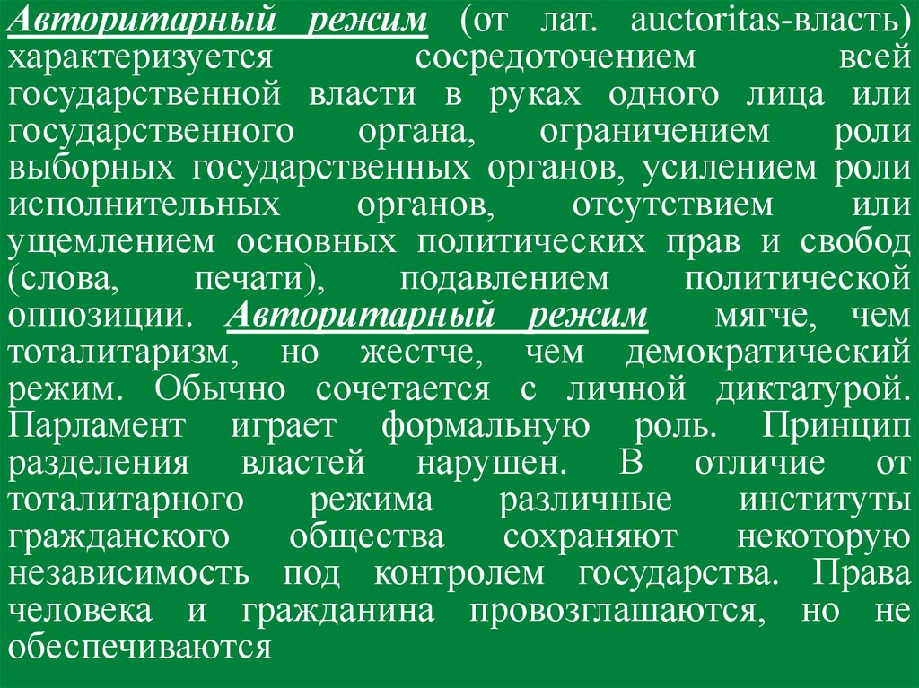 Авторитарный режим (от лат. аuctoritas-власть)характеризуется