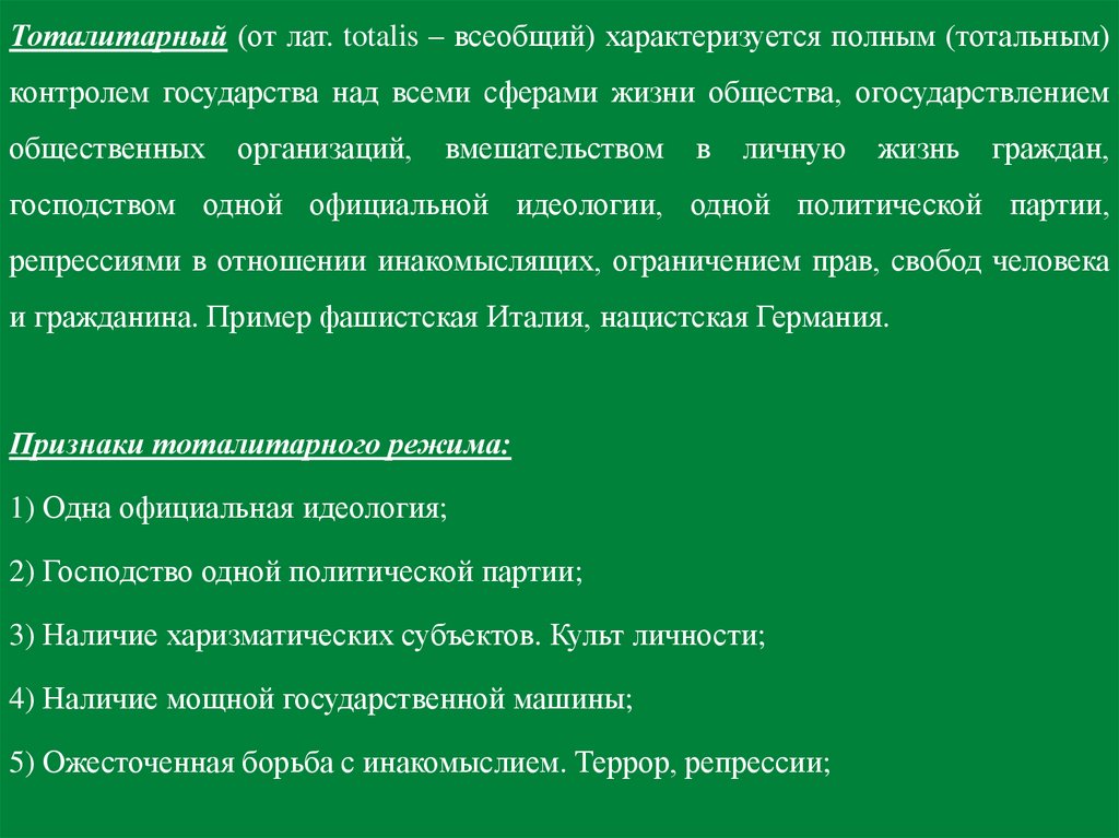 Тоталитарный (от лат. totalis – всеобщий) характеризуется полным (тотальным)контролем государства над всеми сферами жизни общества, огосударствлением