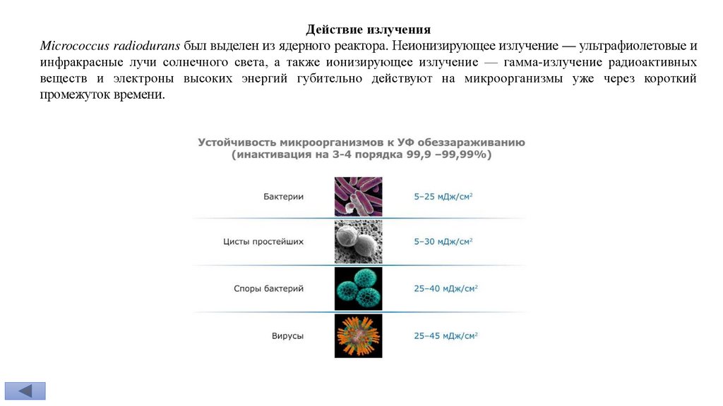 Действие излученияMicrococcus radiodurans был выделен из ядерного реактора. Неионизирующее излучение — ультрафиолетовые и
