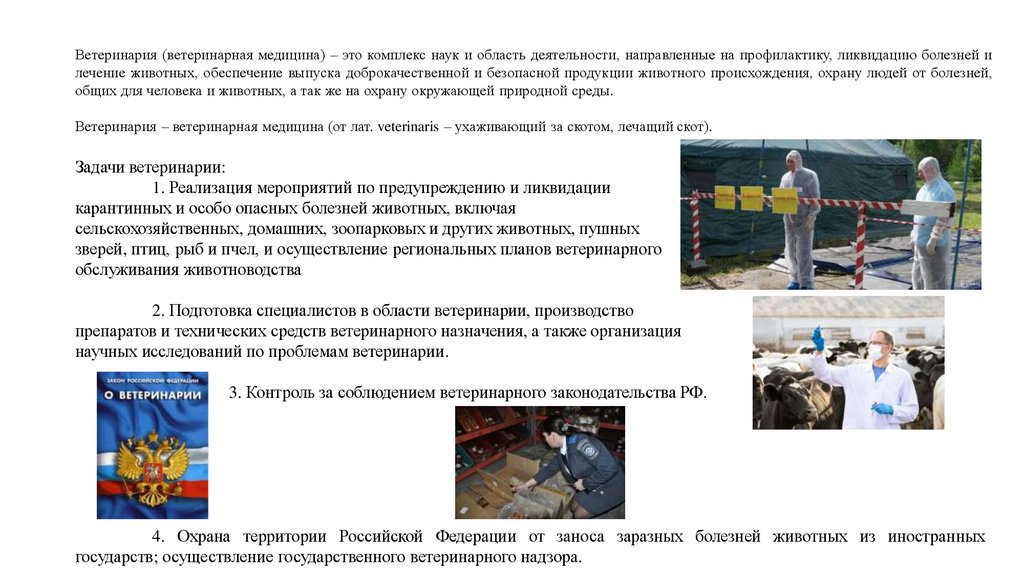 Ветеринария (ветеринарная медицина) – это комплекс наук и область деятельности, направленные на профилактику, ликвидацию болезней илечение животных, обеспечение выпуска доброкачественной и безопасной продукции животного происхождения, охрану людей от болезней,