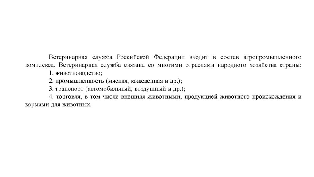 Ветеринарная служба Российской Федерации входит в состав агропромышленногокомплекса. Ветеринарная служба связана со многими отраслями народного хозяйства страны: