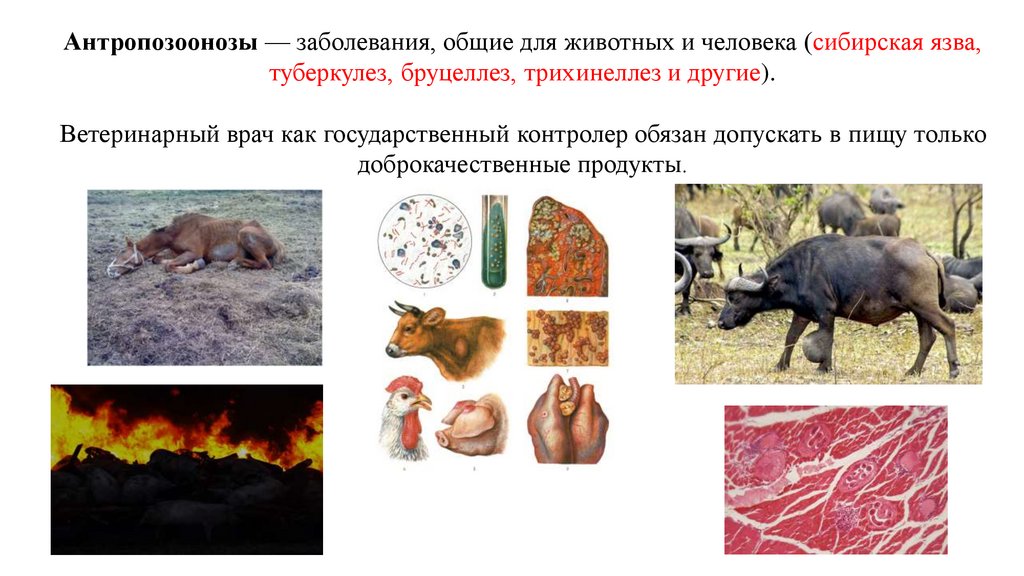Антропозоонозы — заболевания, общие для животных и человека (сибирская язва,туберкулез, бруцеллез, трихинеллез и другие).