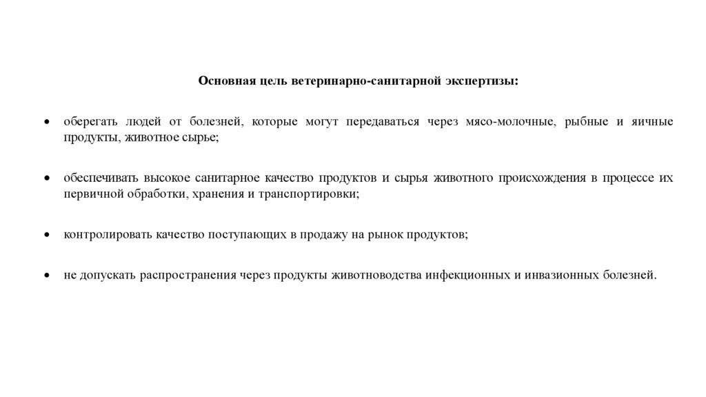 Основная цель ветеринарно-санитарной экспертизы:оберегать людей от болезней, которые могут передаваться через мясо-молочные, рыбные и яичные