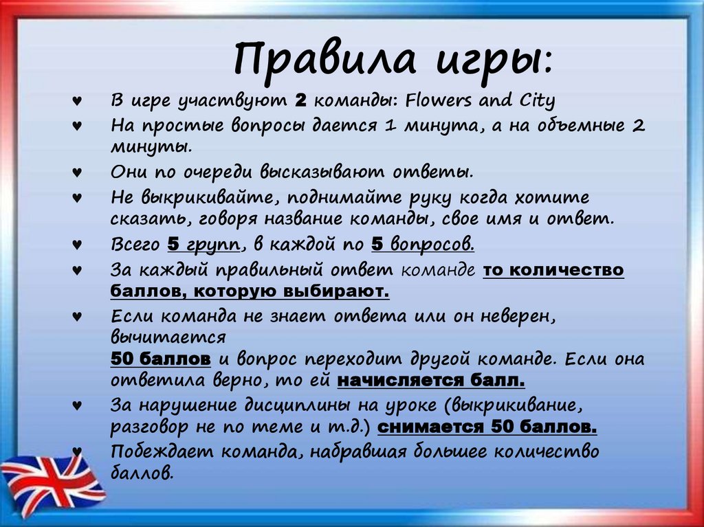 В игре участвуют 2 команды: Flowers and CityНа простые вопросы дается 1 минута, а на объемные 2