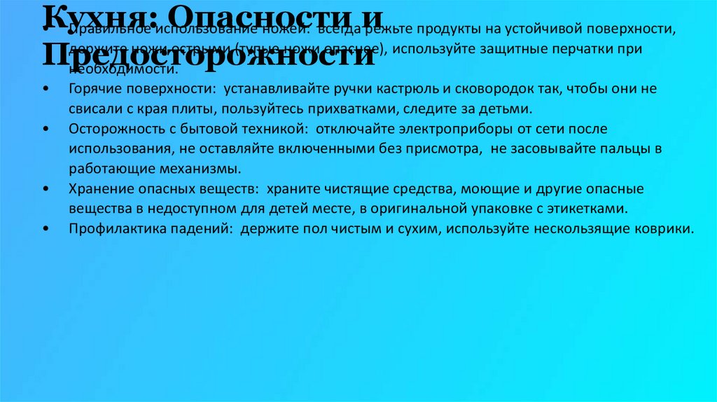 держите ножи острыми (тупые ножи опаснее), используйте защитные перчатки при