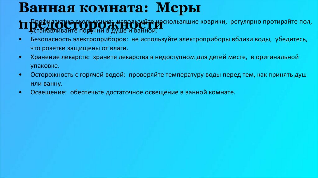 Ванная комната: Меры• Профилактика скольжения: используйте нескользящие коврики, регулярно протирайте пол,
