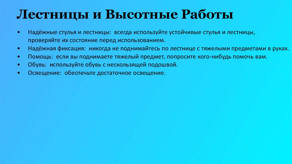 Лестницы и Высотные РаботыНадёжные стулья и лестницы: всегда используйте устойчивые стулья и лестницы,