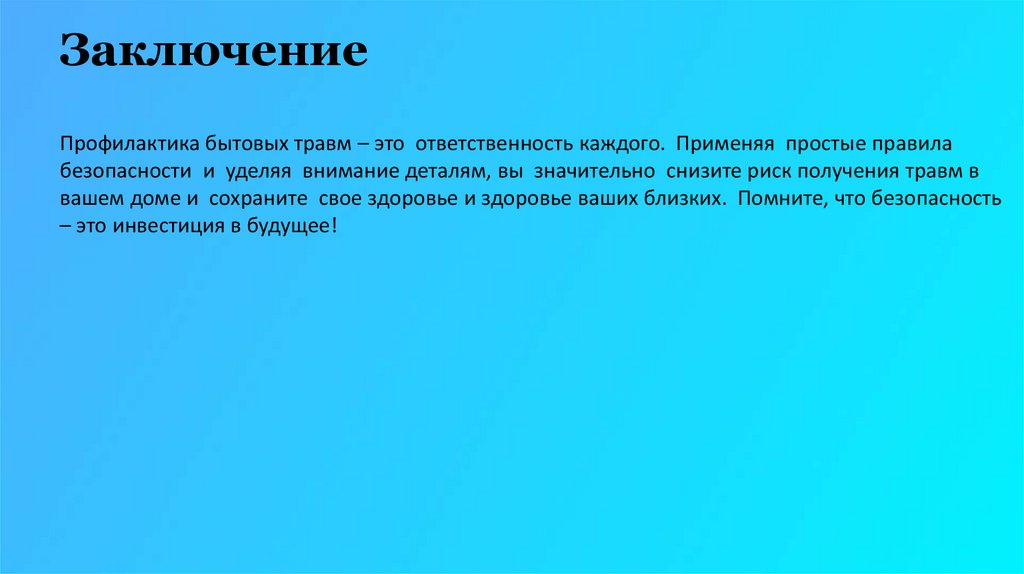 ЗаключениеПрофилактика бытовых травм – это ответственность каждого. Применяя простые правила