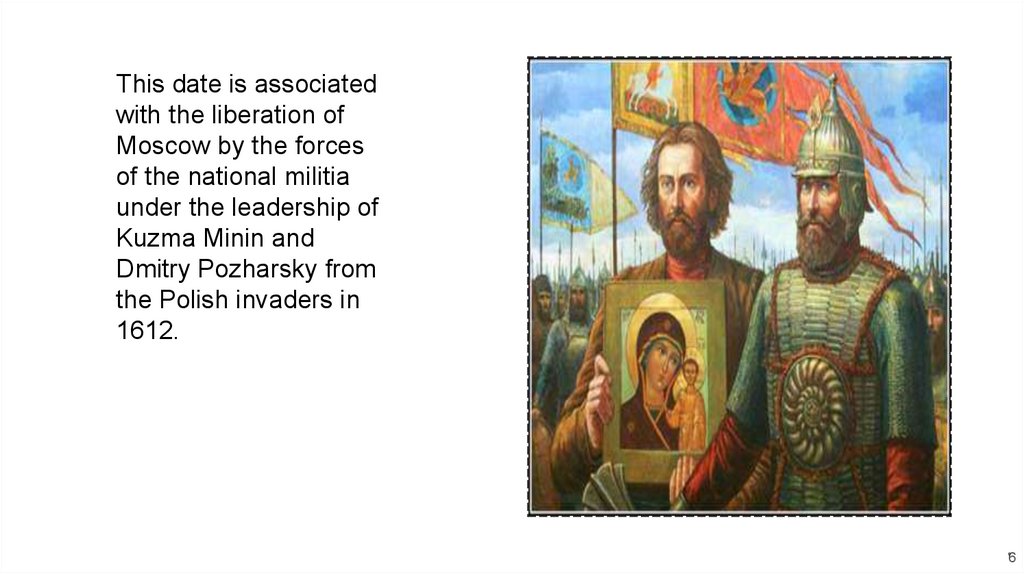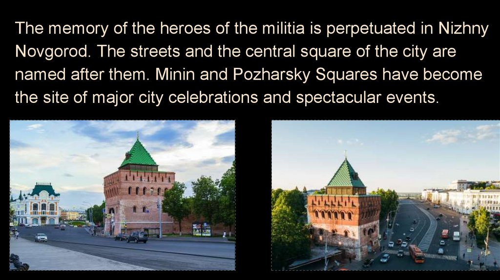 The memory of the heroes of the militia is perpetuated in NizhnyNovgorod. The streets and the central square of the city are