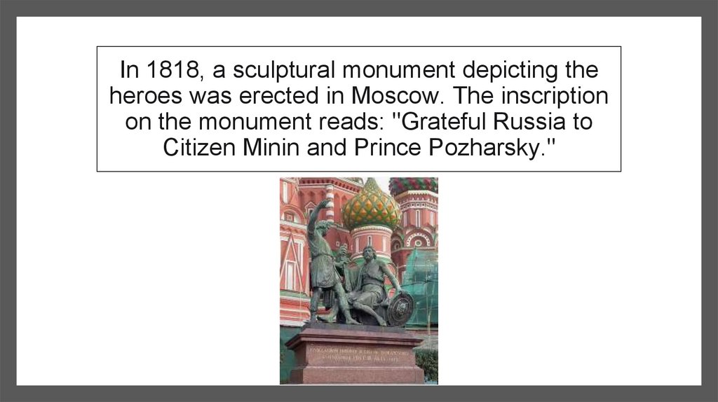 In 1818, a sculptural monument depicting theheroes was erected in Moscow. The inscription