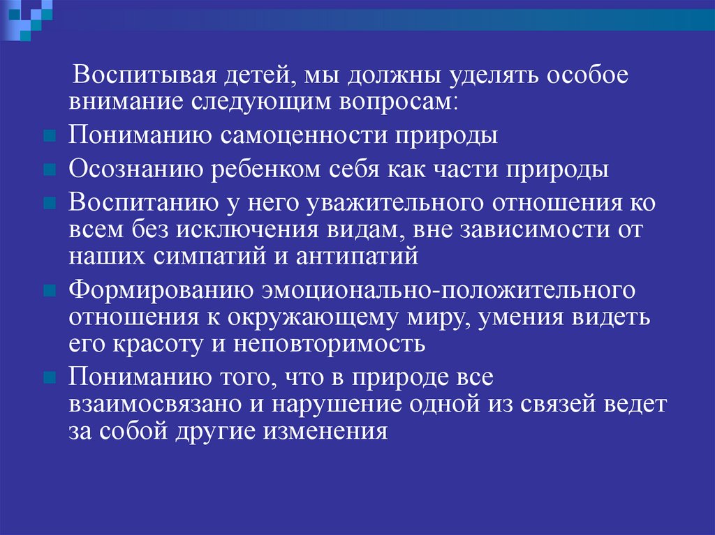 Воспитывая детей, мы должны уделять особоевнимание следующим вопросам: