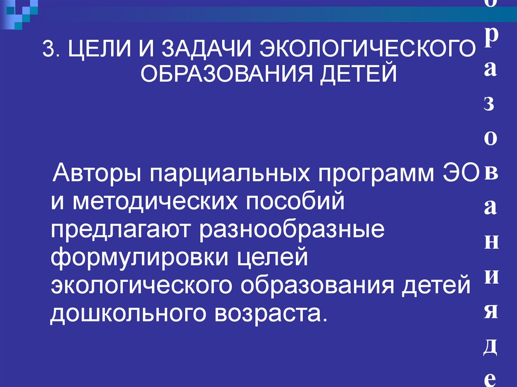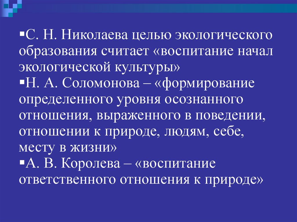 С. Н. Николаева целью экологическогообразования считает «воспитание начал