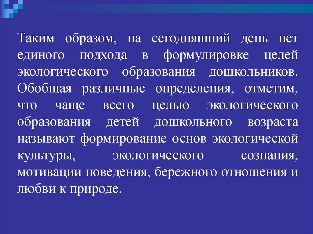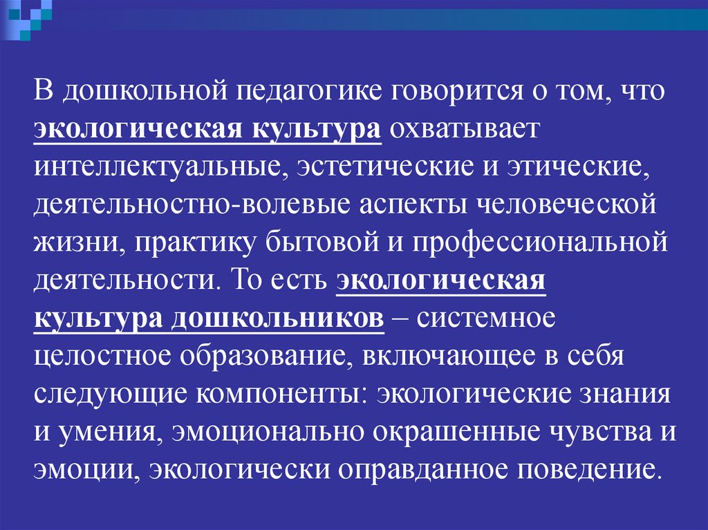 В дошкольной педагогике говорится о том, чтоэкологическая культура охватывает