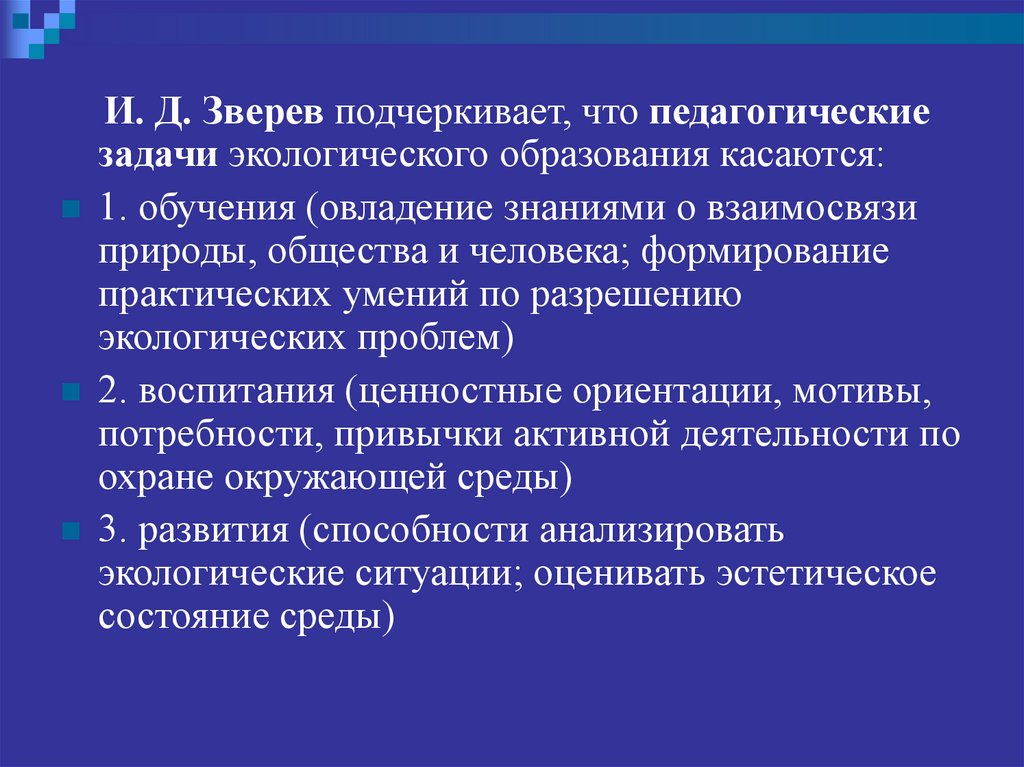 И. Д. Зверев подчеркивает, что педагогическиезадачи экологического образования касаются: