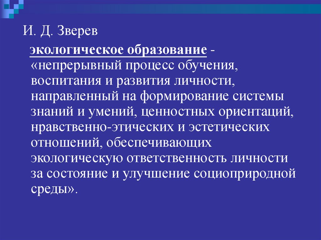 И. Д. Зверевэкологическое образование «непрерывный процесс обучения,