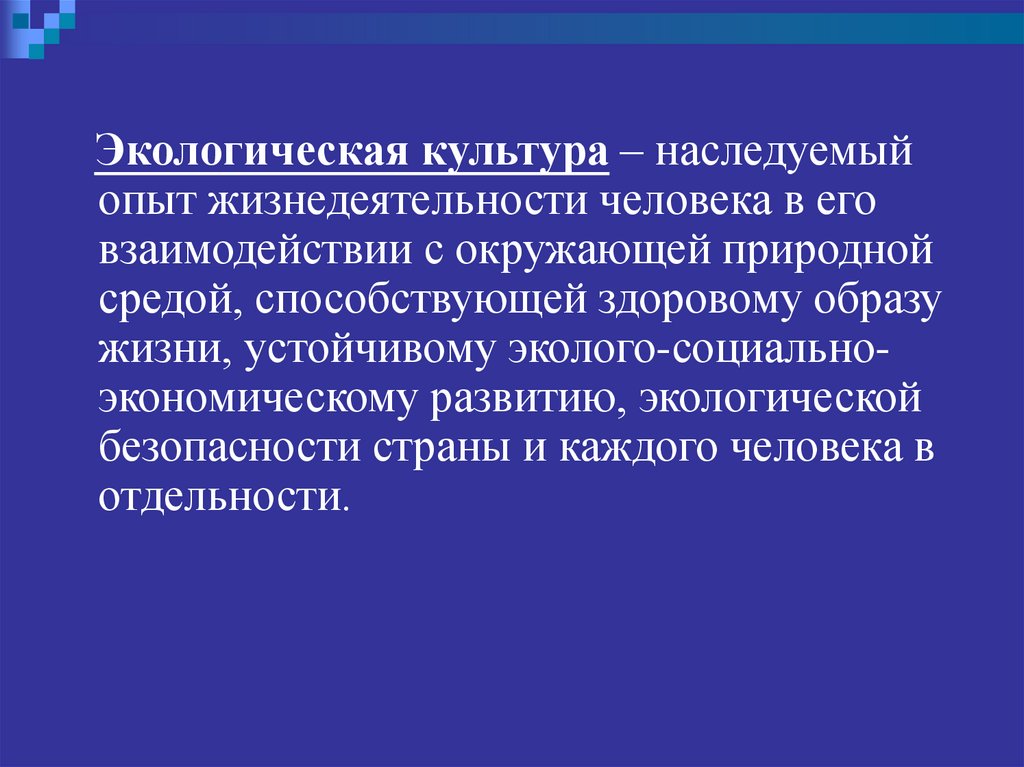 Экологическая культура – наследуемыйопыт жизнедеятельности человека в его