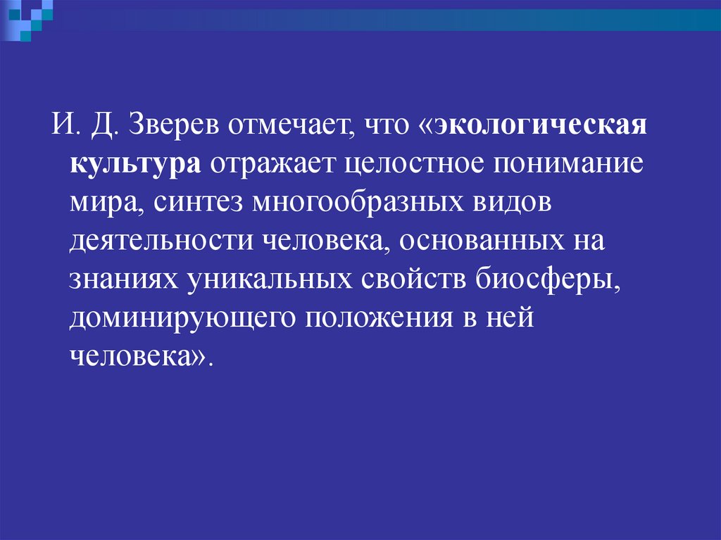 И. Д. Зверев отмечает, что «экологическаякультура отражает целостное понимание