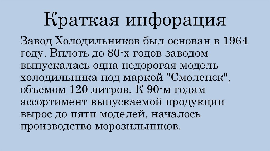 Краткая инфорацияЗавод Холодильников был основан в 1964