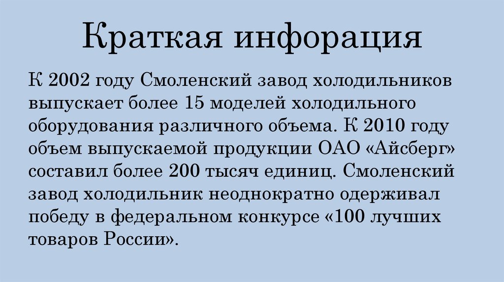 Краткая инфорацияК 2002 году Смоленский завод холодильников