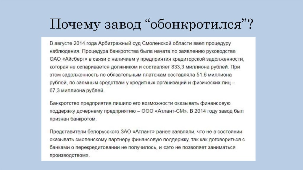Почему завод “обонкротился”?16.