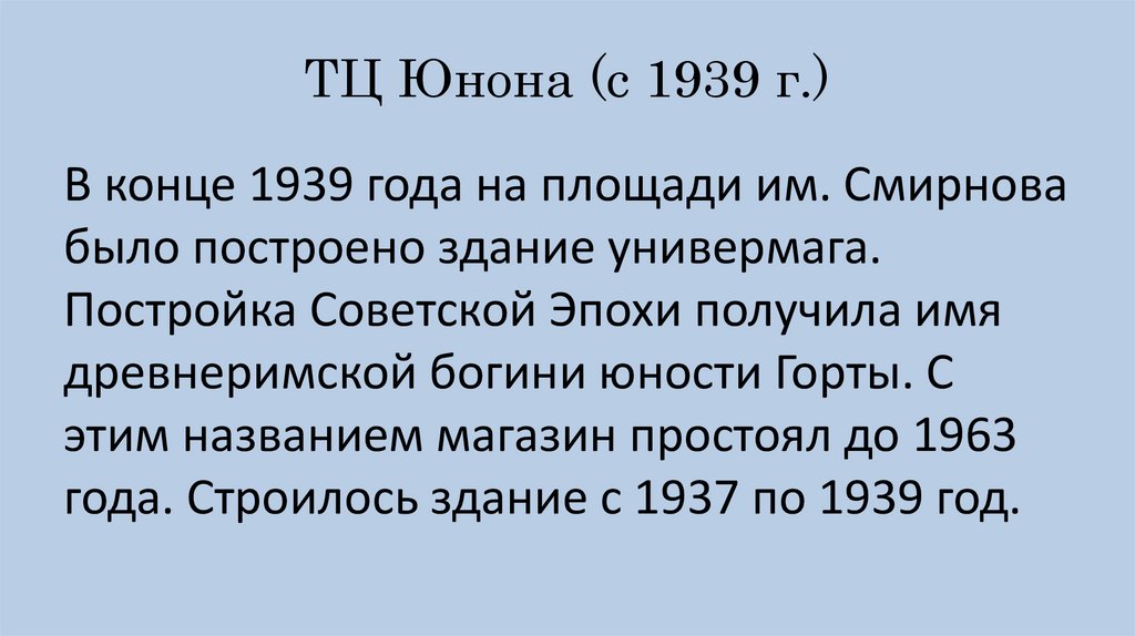 ТЦ Юнона (с 1939 г.)В конце 1939 года на площади им. Смирнова