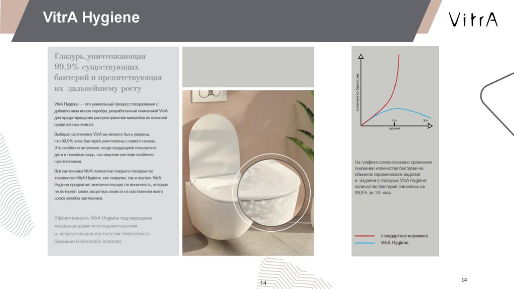 унитаза глазурью на уровень 2 мм над ободком. VitrA Hygiene – глазурь уничтожающая бактерии! Это гарантирует долгий срок эксплуатаци изделия