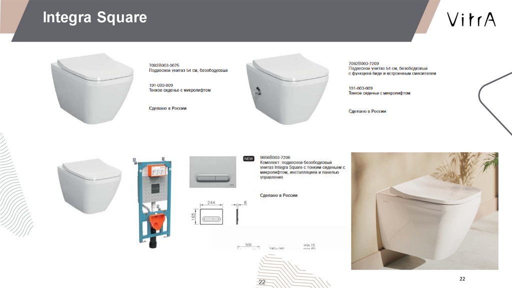 Integra SquareКоллекция Integra от VitrA предлагает широкий ассортимент продукции для разнообразного дизайна ванной комнаты, сочетая естественные и