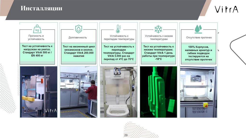 изделия VitrA проходят тест на нагрузку в 300 кг. Это гарантирует высокий уровень прочности.