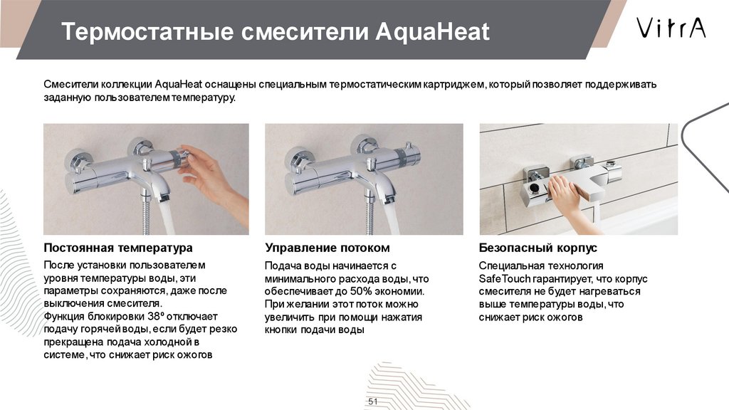 Термостатные смесители AquaHeatСмесители коллекции AquaHeat оснащены специальным термостатическим картриджем, который позволяет поддерживать