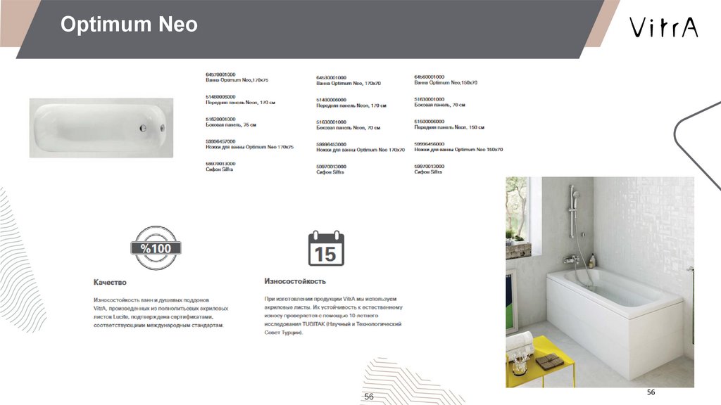 дно и края упрочнены панелями из МДФ. Кроме того, ванны VitrA тестируются на нагрузку в 150 кг на дно и